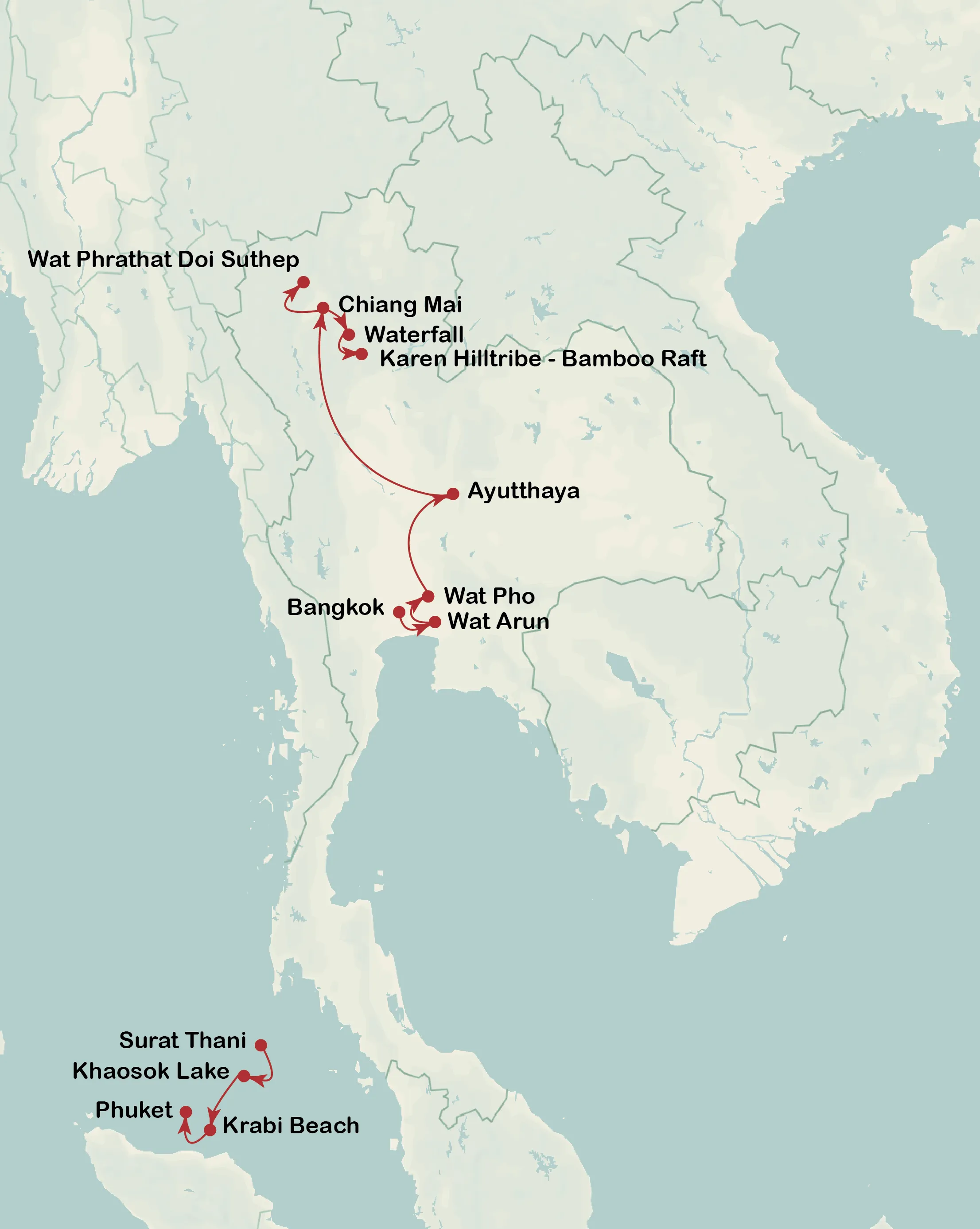Bangkok - Klong - Wat Arun - Wat Pho - Ayutthaya - Chiang Mai - Doi Suthep - Waterfall - Karen Hilltribe - Bamboo Raft