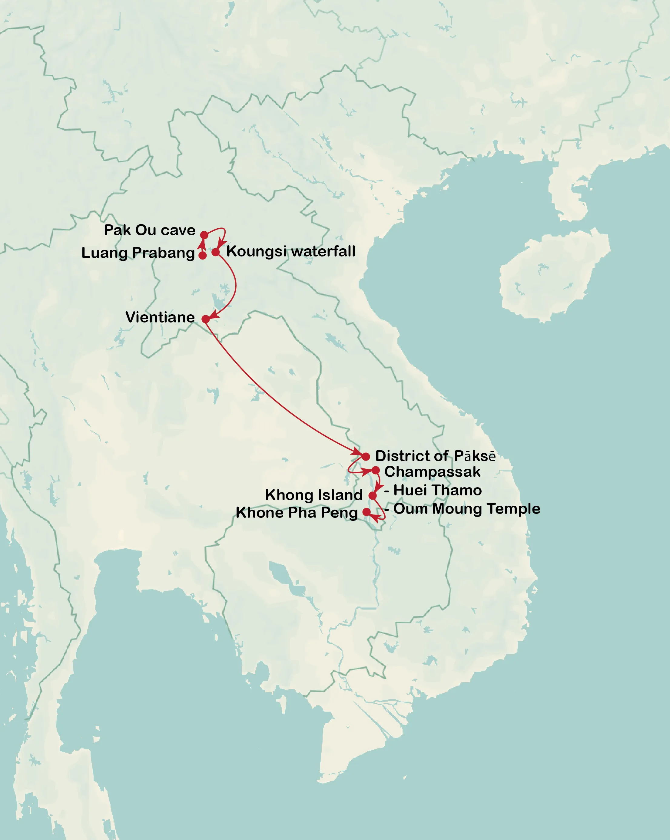Luang Prabang - Pak Ou Cave - Khouang Si Waterfall - Vientiane - Pakse - Champassak - Huei Thamo - Oum Moung Temple - Khong Island - Ban Veuthong - Pakse