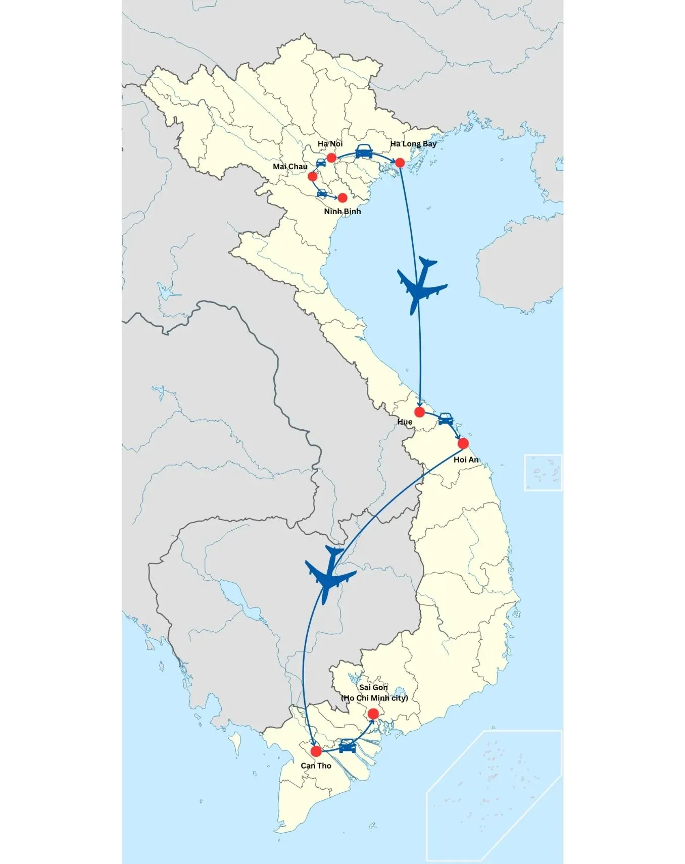 Hanoi – Duong Lam – Mai Chau – Ninh Binh – Halong Bay – Hue – Hoian – Mekong – Saigon