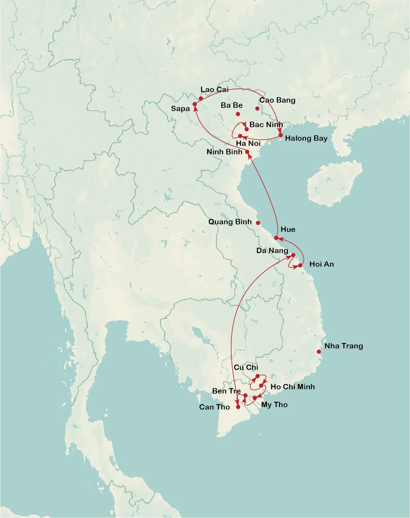 Saigon/ HCM - Cu Chi - Ho Chi Minh - My Tho - Ben Tre - Can Tho - Cai Rang - Danang - Hoian - Bana Hill And Golden Bridge - Hue - Khe Sanh - Vinh Moc - Dong Hoi - Ninh Binh - Hoa Lu - Tam Coc - Sapa - Lao Chai - Lan Ha Bay - Hanoi - Bac Ninh
