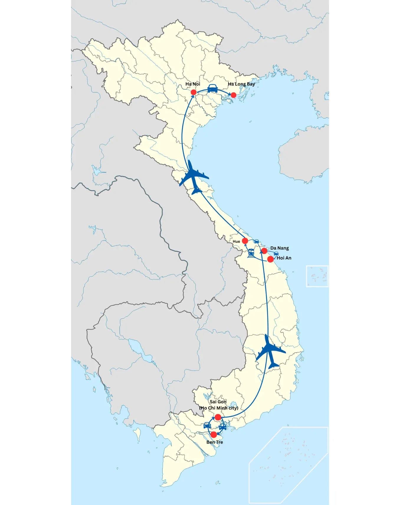 - 3 Domestic flight tickets: Saigon/ HCMC – Nhatrang – Danang - Hanoi (Vietnam Airlines/ Bamboo Airways, with 7 kg hand bag + 20 kg checked luggage)