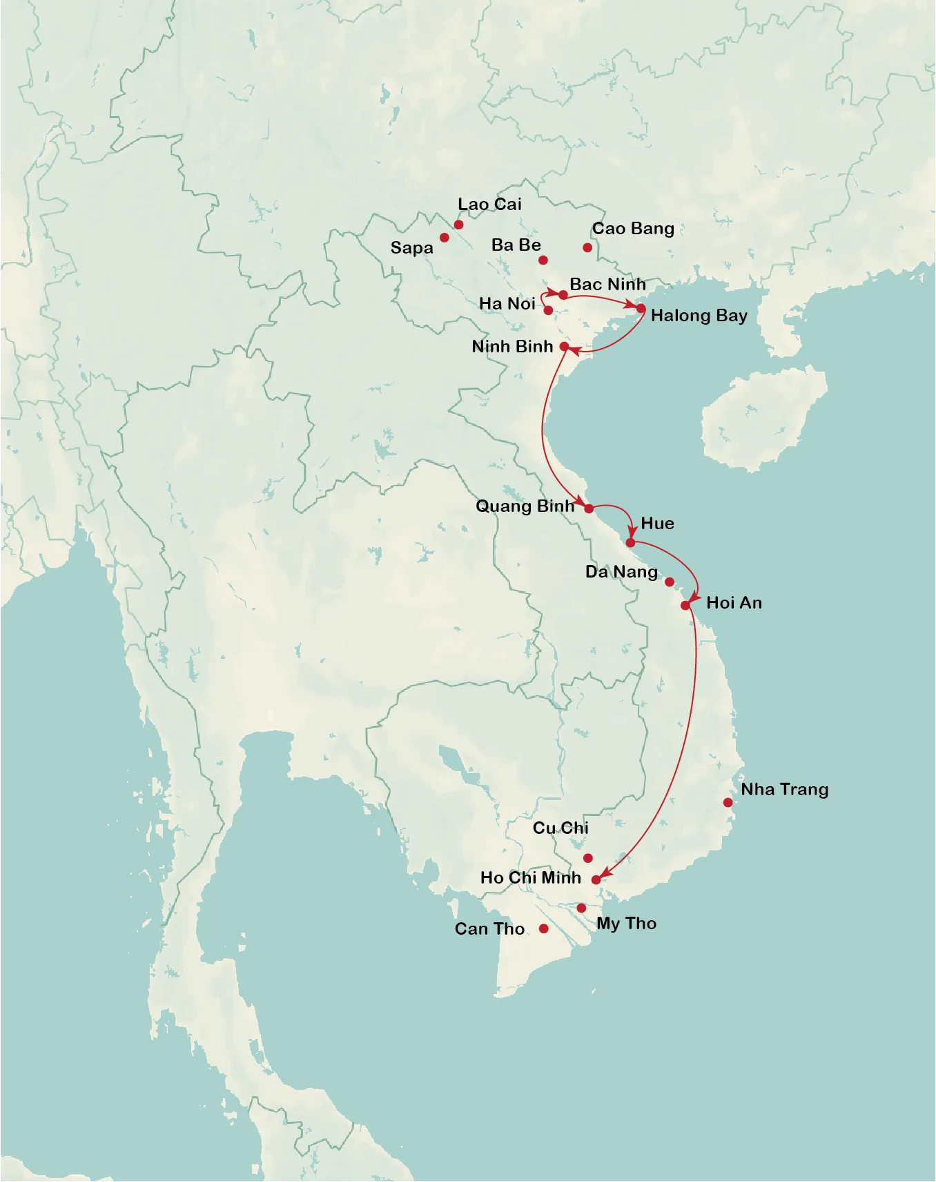 This specialized 14 days itinerary from the North to the South, offering you top 5 amazing Must-see UNESCO Sites including Halong Bay& Phong Nha-Ke Bang Natural heritage, Hue, Hoi An and My Son sanctuary Cultural heritage.Also exploring other incredible stunning landscapes,traditional customs,emotional history and mouth watering Vietnamese cuisine to create your holiday of a lifetime.